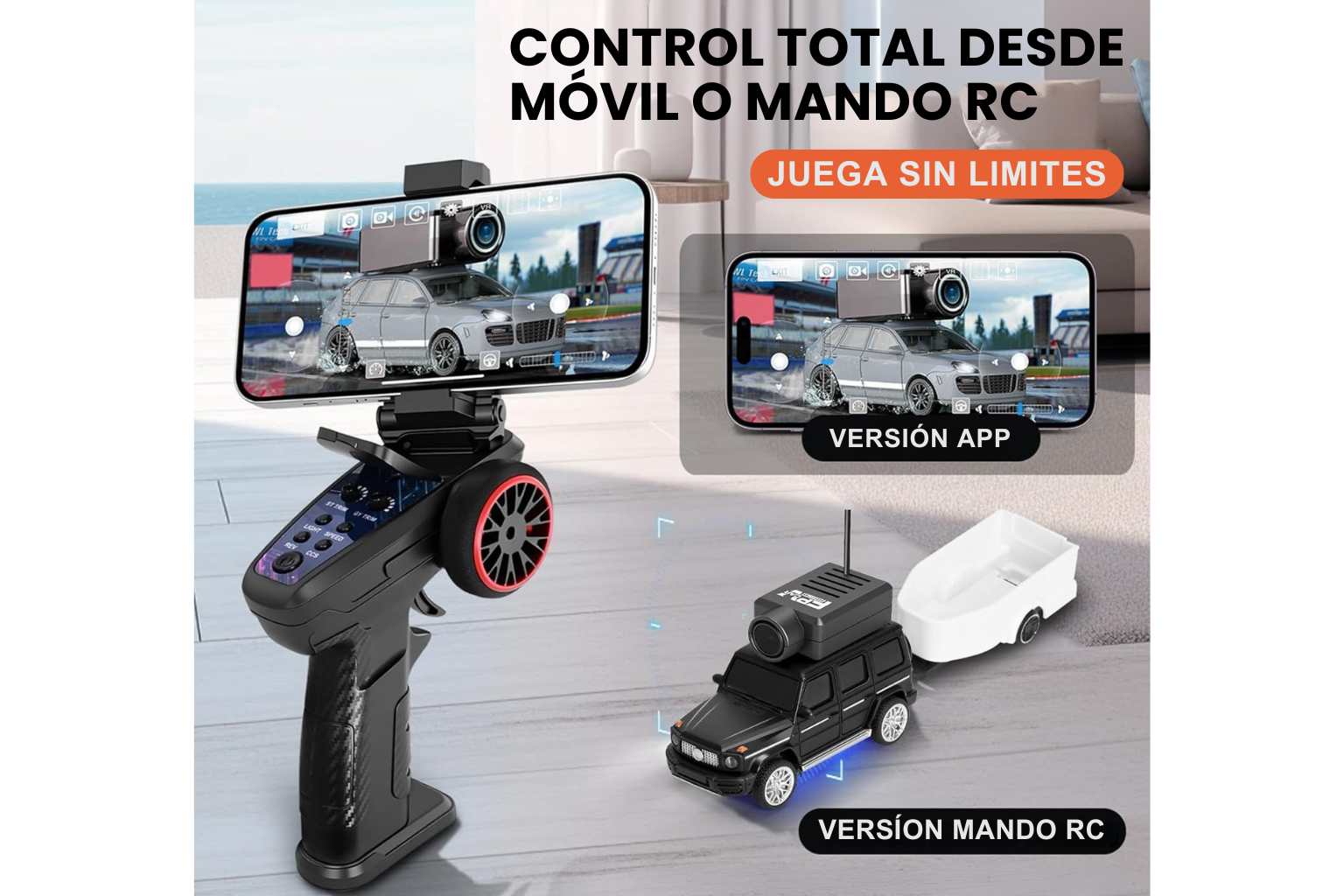 Opcionalmente, puedes añadir el KIT CARCAM RC, que incluye un mando RC tradicional, maletín de transporte y remolques enganchables, para disfrutar también del control clásico y una experiencia aún más completa.